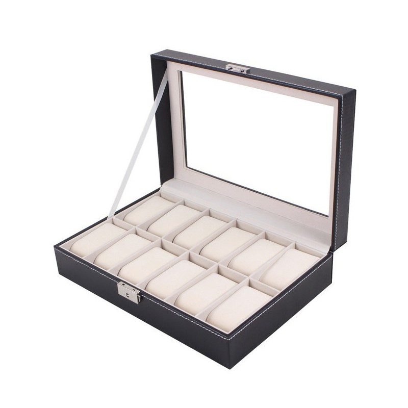 Aceasta cutie permite pastrarea in conditii desavarsite a 10 ceasuri, in spatii bine delimitate si captusite cu catifea moale, in nuanta de crem. Exteriorul cutiei pentru ceasuri este confectionat din piele ecologica neagra, avand pe margini cusaturi fine, asortate cu culoarea matasoasei catifele, desavarsind designul elegant al intregii cutii. In plus, capacul este din geam transparent, spre a oferi admiratiei colectia de ceasuri pe care o adaposteste.