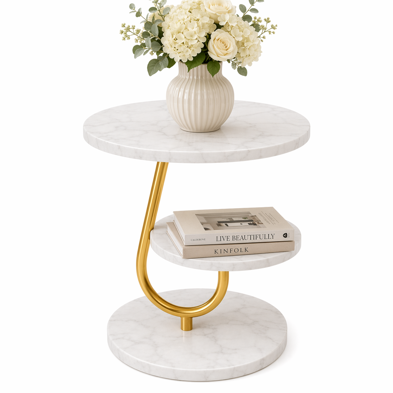 Adauga un accent elegant in living, dormitor sau birou cu o masuta rotunda cu aspect premium. Blatul tip marmura si cadrul metalic auriu ofera un look modern-retro, usor de integrat langa canapea, fotoliu sau pat.