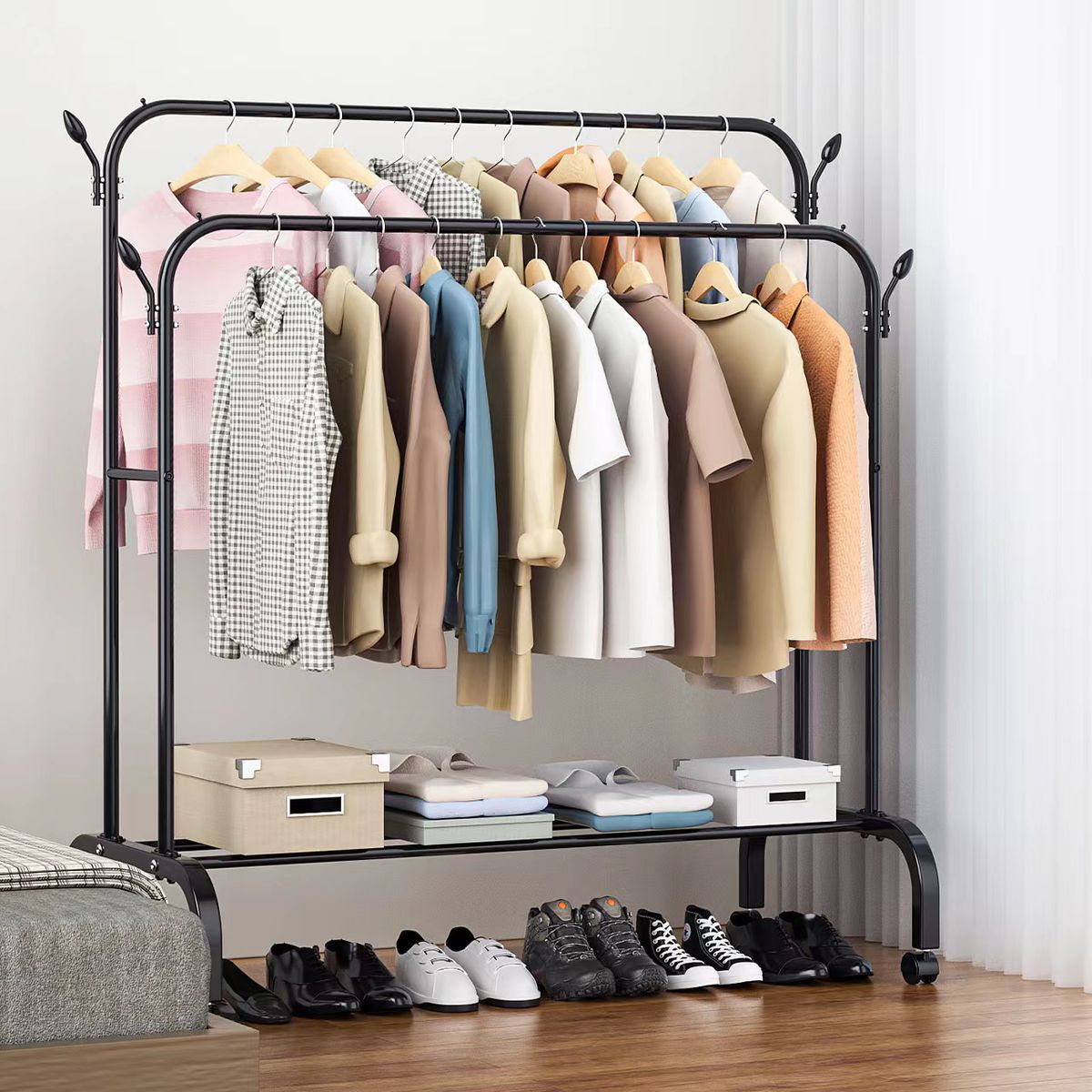 Raftul este perfect pentru companii, magazine, birouri si case! O structura mobila cu roti si instalare usoara, puteti agata multe umerase pe suport. De asemenea, are un suport foarte practic pentru pantofi.