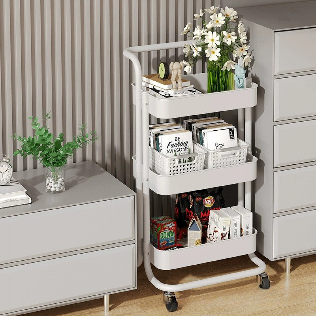Structura solida - atat cadrul, cat si cele trei cosuri sunt confectionate din metal si asigura o stabilitate solida. Raftul este dotat cu 4 rotile rotative 360° rezistente (2 dintre ele sunt prevazute cu functie de franare) si cu un maner metalic pentru ca acesta sa poata fi tranportat mai usor oriunde e nevoie.