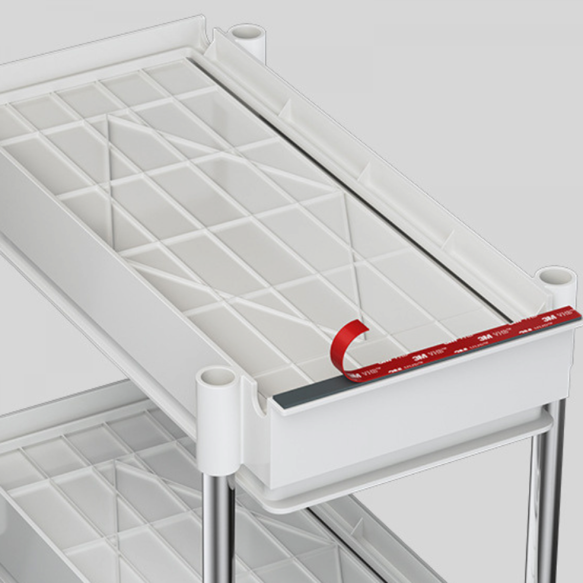 Fiecare raft este prevazut inclusiv cu o tava unde se colecteaza apa adunata in urma scurgerii vaselor proaspat spalate. Structura solida datorata suportilor din inox si care asigura o capacitate mare de depozitare. Fiecare raft poate acomoda pana la 9 vase de dimensiuni. Suportul de jos este prevazut cu o banda adeziva a carei scop este de a asigura o mai buna fixare a scurgatorului.
