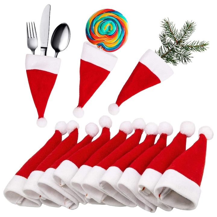 Utilizare universala - Nu doar pentru tacamuri! Aceste caciulite pot fi folosite si ca pungi decorative pentru mici cadouri, bomboane sau mici decoratiuni. Ideale pentru aranjamentele de Craciun pe mese, in restaurante sau cafenele.
