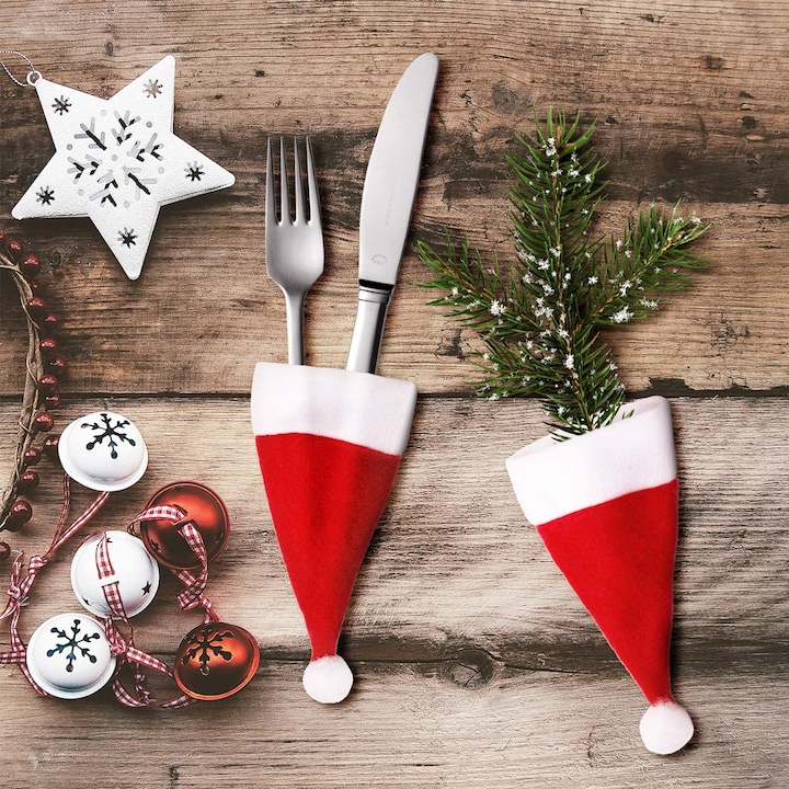 Utilizare universala - Nu doar pentru tacamuri! Aceste caciulite pot fi folosite si ca pungi decorative pentru mici cadouri, bomboane sau mici decoratiuni. Ideale pentru aranjamentele de Craciun pe mese, in restaurante sau cafenele.