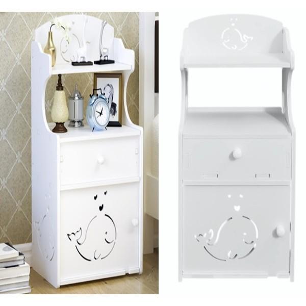 Noptiera poate fi folosita pentru organizarea a diferite articole in camera de odihna, fiind prevazuta cu doua rafturi deschise, un sertar si un raft acoperit de usa. Aceasta noptiera cu design simplu si modern imbina intr-un mod armonios latura practica cu cea estetica, fiind atat un element decorativ, cat si unul functional. Aceasta este realizata din PVC Komatex alb, un material cu greutate redusa, rezistent la umiditate si usor de curatat.
