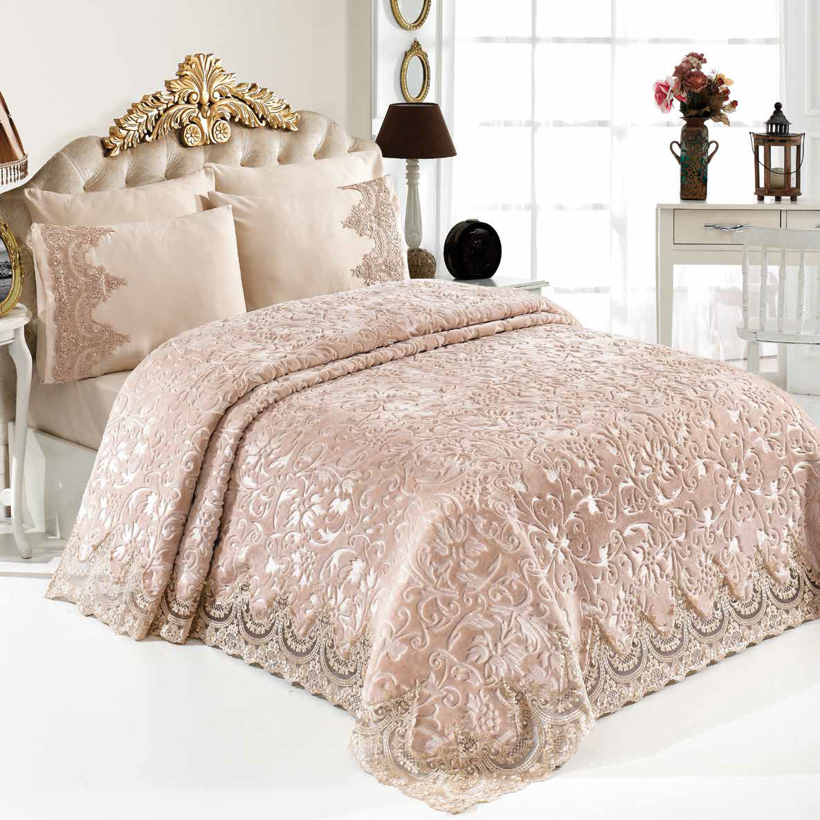 Set cuvertura de lux, cu 6 piese si broderie eleganta. Cuvertura este fina, atent lucrata, cu broderie aplicata manual, pentru pat matrimonial