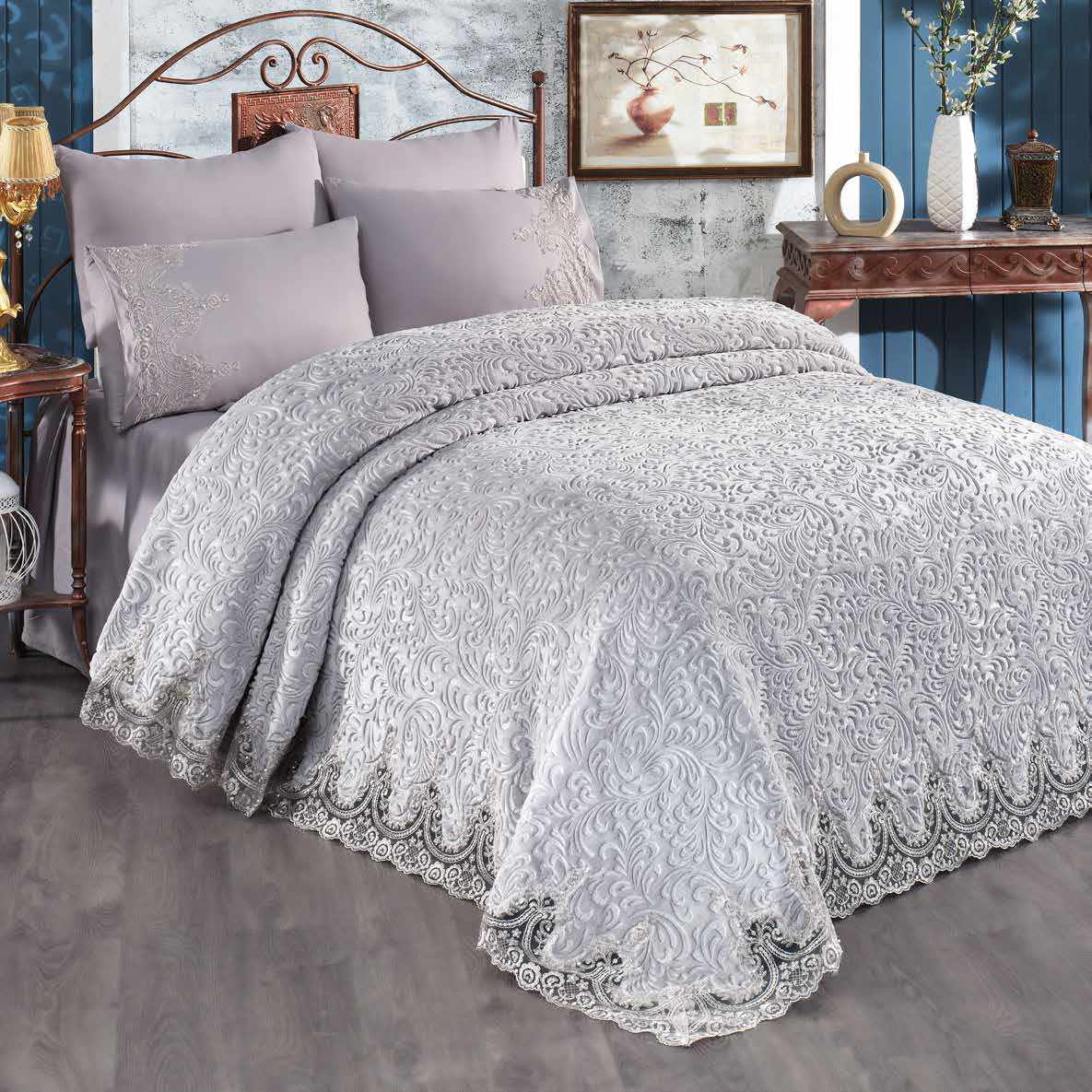 Set cuvertura de lux, cu 6 piese si broderie eleganta. Cuvertura este fina, atent lucrata, cu broderie aplicata manual, pentru pat matrimonial