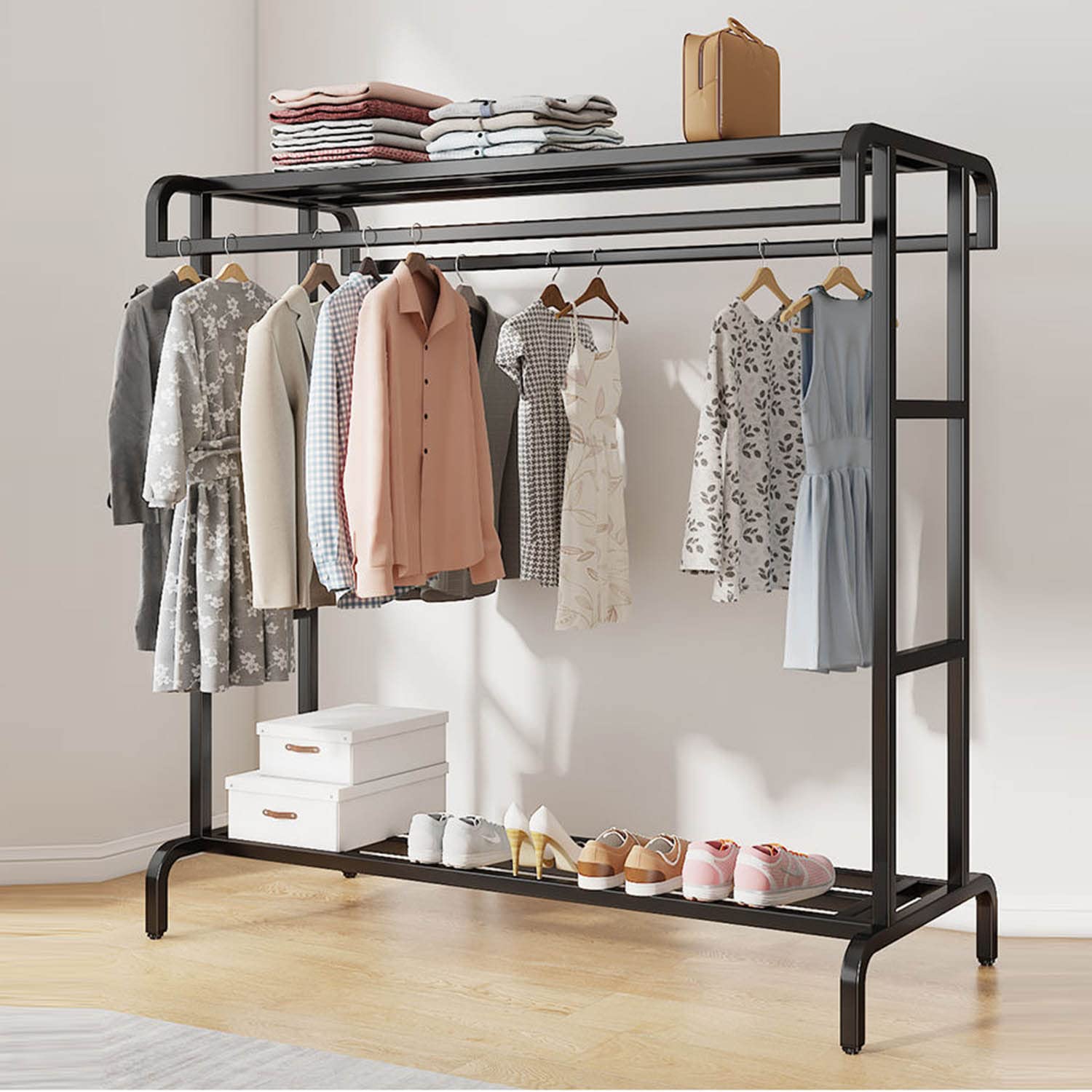 Un suport practic si robust pentru haine, ideal pentru organizarea eficienta a dormitorului, holului, spalatoriei sau oricarui spatiu cu depozitare limitata. Teava din fier este solida si rezistenta la deformare, oferind stabilitate pentru haine si chiar articole voluminoase precum paturi.